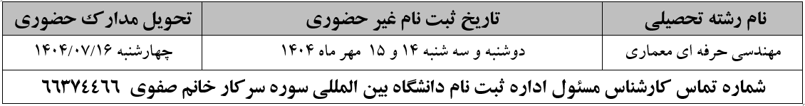 8- دانشجویان در صورت داشتن هرگونه سوال پس از تکمیل ثبت نام درخصوص چگونگی کلاس ها ، ورود در کلاس و ... با کارشناس آموزشی خود آقای باغبان (کارشناس آموزشی رشته مهندسی حرفه ای معماری) تماس حاصل نمایند .