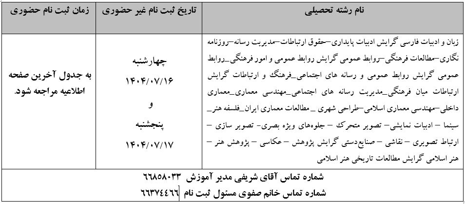 6- اصل مدارک به مسئول اداره پذیرش و ثبت نام از 20 مهر ماه 1404 مطابق جدول رشته ها تحویل شود.