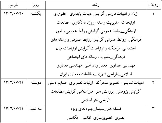 تاریخ و روز رشته ها جهت تحویل مدارک حضوری: