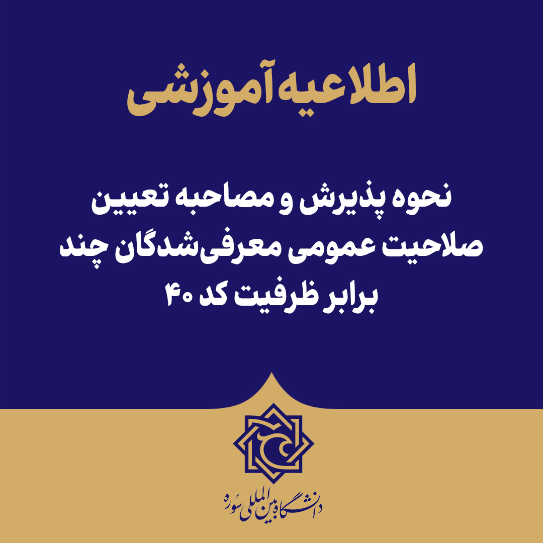 اطلاعيه شماره 1 : نحوه پذيرش و مصاحبه تعیین صلاحیت عمومی معرفیشدگان چند برابر ظرفيت کد 40 دانشگاه بینالمللی سوره در آزمون سراسري سال 1404 (کارشناسی پیوسته)