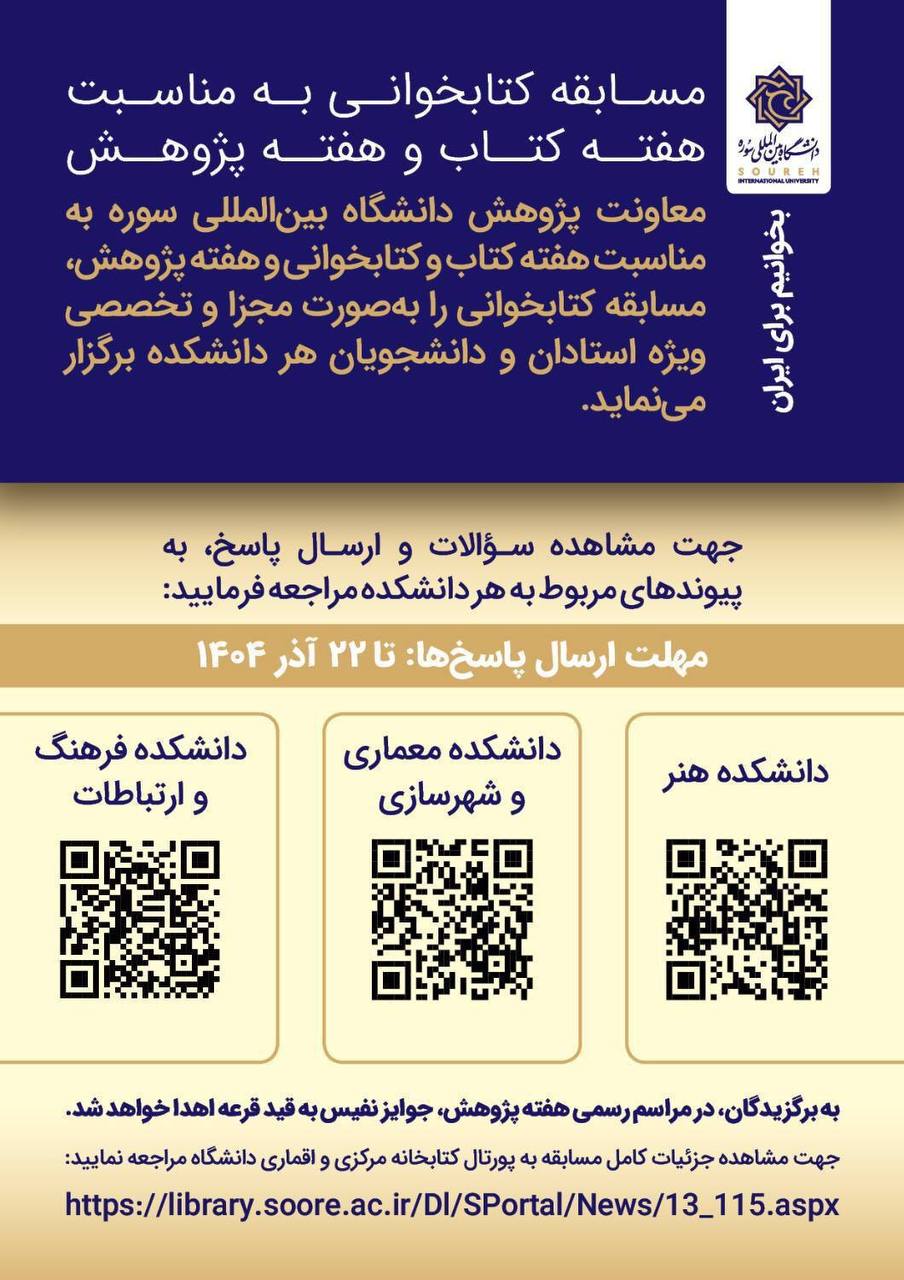 به گزارش روابط عمومی دانشگاه بینالمللی سوره، معاونت پژوهشی دانشگاه به مناسبت هفته «كتاب، کتابخوانی و كتابدار» و هفته «پژوهش»، مسابقه کتابخوانی را بهصورت مجزا و تخصصی ویژه اعضای هیئت علمی و دانشجویان هر دانشکده برگزار مینماید.