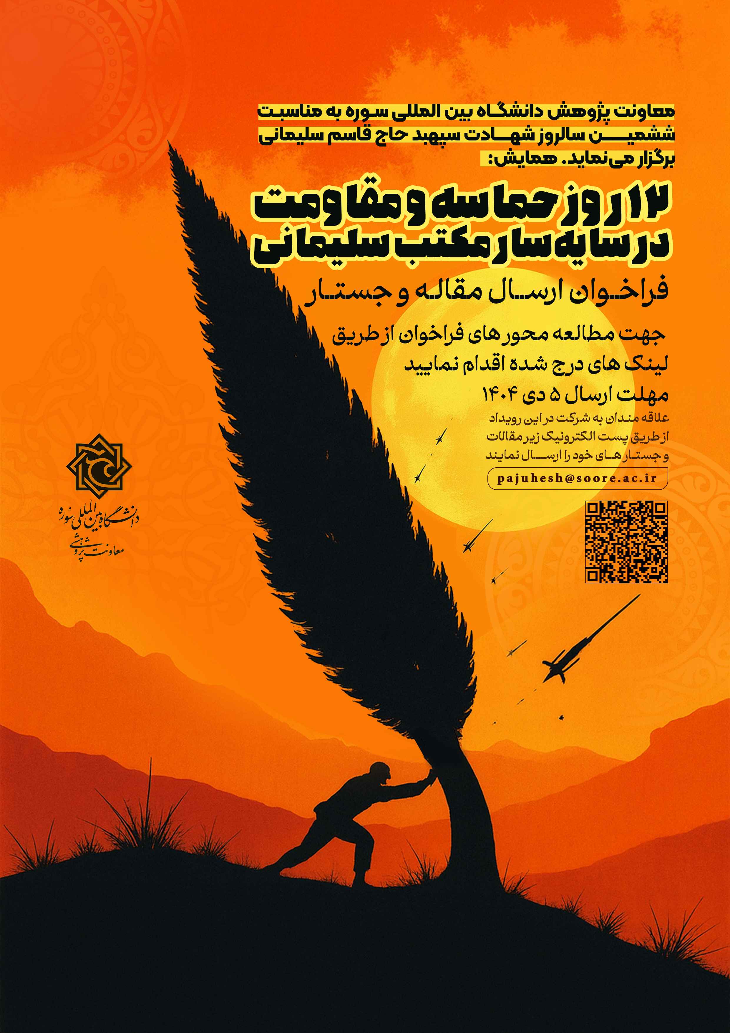 به گزارش روابط عمومی دانشگاه بینالمللی سوره، معاونت پژوهش دانشگاه همایشی را به مناسبت گرامیداشت «ششمین سالگرد شهادت سردار سلیمانی» و همچنین «۱۲ روز حماسه و مقاومت»، به منظور تبیین علمی ابعاد مختلف مکتب حاج قاسم، بازخوانی روایتهای مقاومت، تقویت هویت ملی و بررسی تجربه تاریخی ۱۲ روز جنگ تحمیلی برگزار میکند. پژوهشگران، اساتید، دانشجویان و علاقهمندان میتوانند جهت شرکت در این فراخوان آثار خود را تا تاریخ 5 دی ماه در قالب مقاله وجستار در محورهای زیر به آدرس pajuhesh@soore.ac.ir ارسال نمایند.